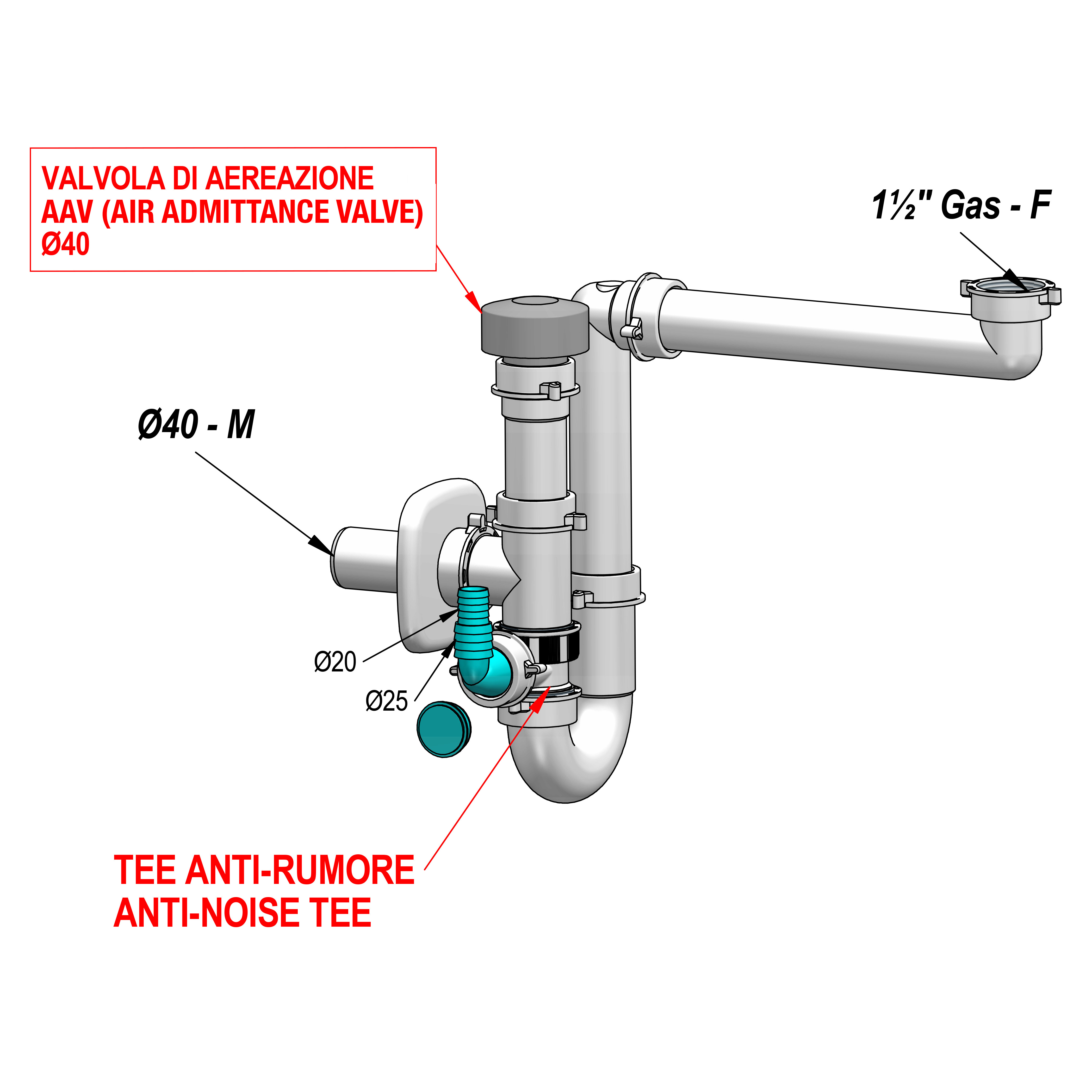 Siphon gain de place pour évier simple cuve avec té anti-bruit et valve d’aération.